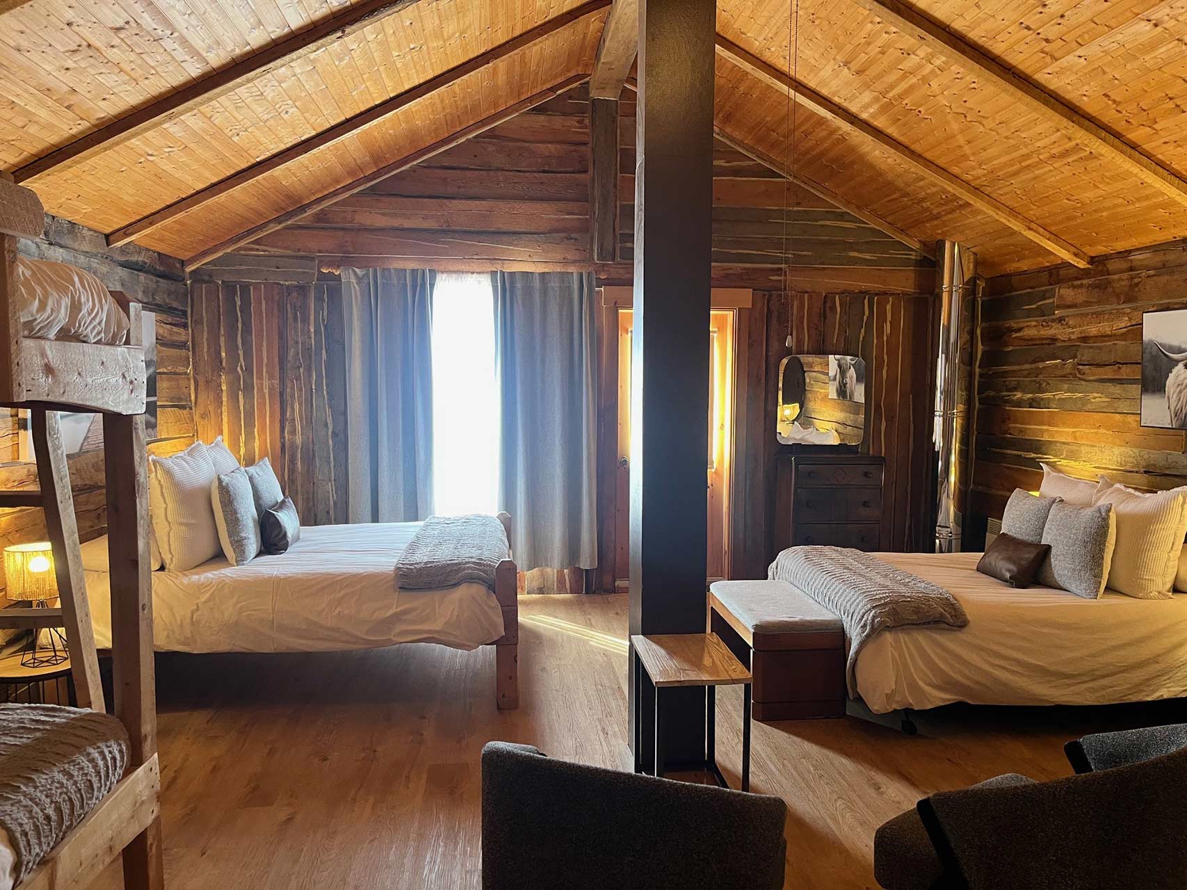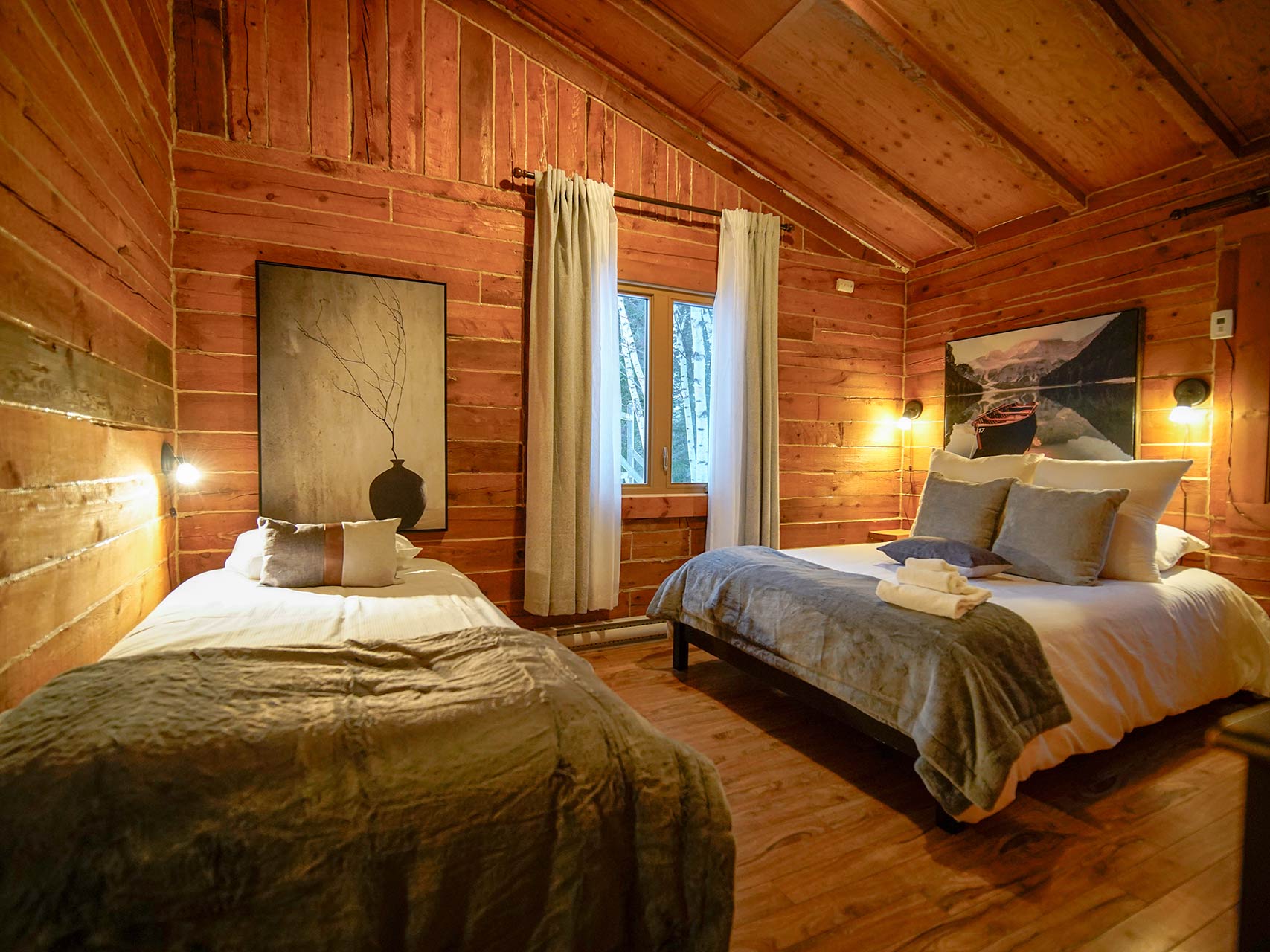 Cette chambre en bois chaleureuse et confortable avec une capacité de 2 à 4 personnes offre une vue sur le Fjord du Saguenay. Elle est équipée d’un lit double (certaines ont un lit simple ou 2 lits simples superposés supplémentaires) et d’une salle de bain privée (toilette, douche, lavabo).
